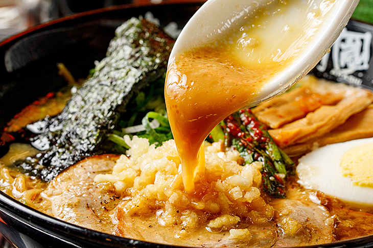 花月嵐的招牌大蒜拳骨湯頭,由創始者北条晉一所開發,維持數十年超高人氣。「大蒜拳骨拉麵」中使用豚骨中養分含量最高的優質「拳骨」、大量的上選大蒜、嚴選素材,與日本道地的豬背精華油脂,以特殊製法熬煮,將養分與美味融入湯汁中,成為「花月嵐拉麵」最引以為傲的特製秘傳湯頭。